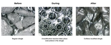 GoNano technology has changed how roof sealants work. Traditional shingles are sealed with oil, which simply fills the gaps between them. GoNano works deeper—it permanently modifies and strengthens the molecular structure of each asphalt shingle. After application, a reaction inside the shingle creates S1 particles, which bond the granules together. This inside-out protection forms a stronger barrier against the elements and helps extend the lifespan of your roof for up to 15 years, saving you money.